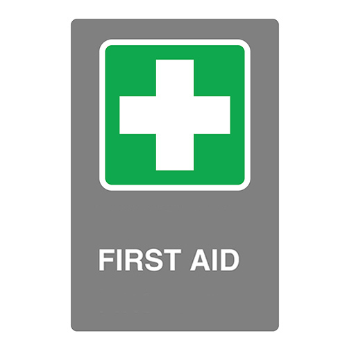 Gray background, black lettering and pictogram. Visual: FIRST AID FIRST AID