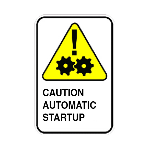 Sign – Caution: automatic start-up Dimensions: 12×18 Aluminum 064 Rounded corners Engineer-grade vinyl Black outline White background, yellow and black pictogram. Price per unit