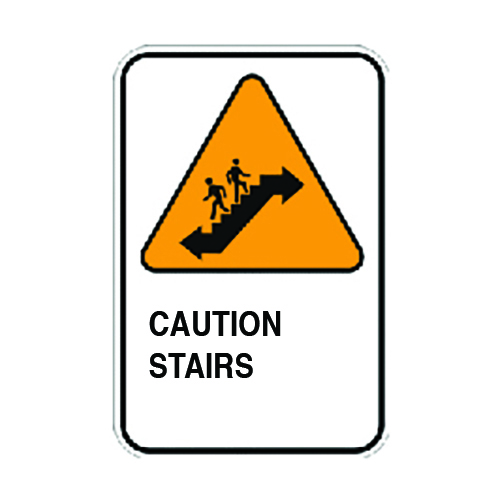 Poster – Caution stairs Dimensions: 12×18 Aluminum 064 Rounded corners Engineer grade vinyl Black outline White background, yellow and black pictogram. Price per unit