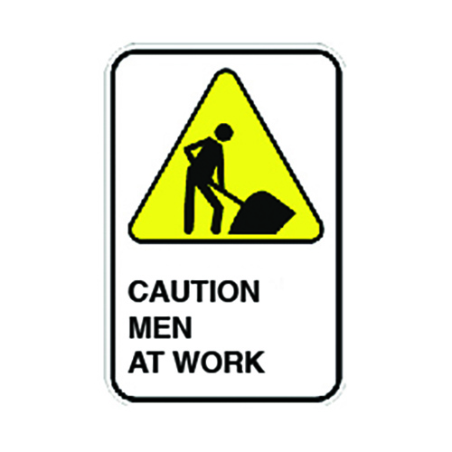 Sign – Caution: Men at Work Dimensions: 12×18 Aluminum 064 Rounded corners Engineer-grade vinyl Black outline White background, yellow and black pictogram. Price per unit