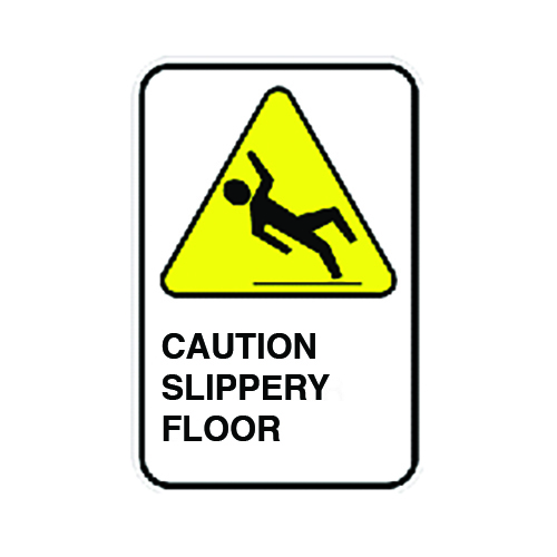Sign – Caution: Slippery Floor Dimensions: 12×18 Aluminum 064 Rounded corners Engineer-grade vinyl Black outline White background, yellow and black pictogram. Price per unit