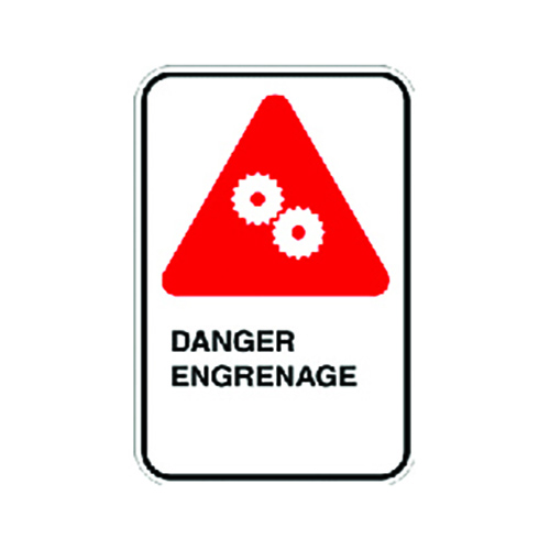 Affiche danger engrenage Dimensions 12×18 Aluminium 064 Coins arrondis Vinyle grade ingénieur Impression UV Contours noirs Fond blanc, lettrage noir avec pictogramme rouge Prix à l’unité