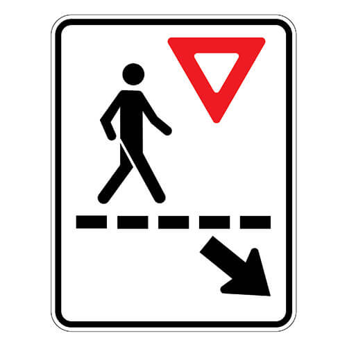 Affiche passage piéton à droite Dimensions 24×30 Aluminium 0.064 Vinyle grade ingénieur Impression UV Fond blanc Lettrage noir Avec pictogrammes Prix à l’unité