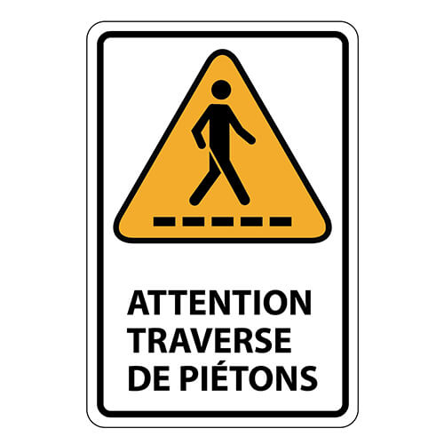 *** Fabriqué au Québec *** Affiche en aluminium 0.064, vinyle grade ingénieur imprimé laminé glacé. Fond blanc, pictogramme jaune et noir. ATTENTION TRAVERSE DE PIÉTONS