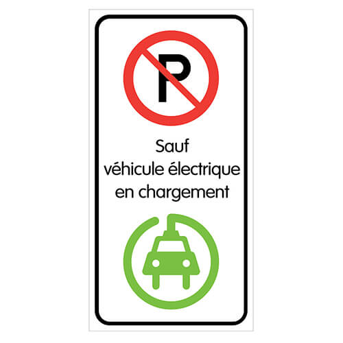 Fond blanc, lettrage noir, pictogrammes Visuel: SAUF VÉHICULE ÉLECTRIQUE EN CHARGEMENT.