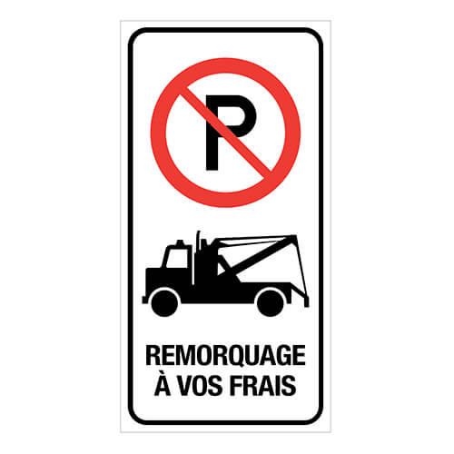 Fond blanc, lettrage et pictogramme noir et rouge. PICTOGRAMME STATIONNEMENT INTERDIT, REMORQUAGE À VOS FRAIS.