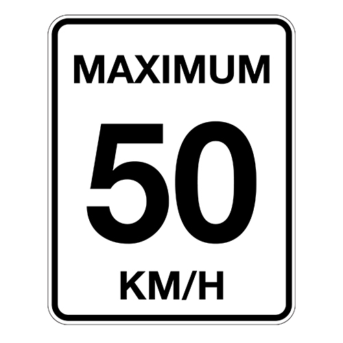Affiche Vitesse maximum autorisée: 50 Dimensions : 24×30 Aluminium 064 Vinyle grade ingénieur Impression UV Coins arrondis Fond blanc, lettrage et contours noirs. Prix à l’unité
