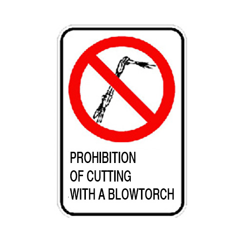 No cutting with a blowtorch Sign – Size: 12×18 – Aluminum 064 – Rounded corners – Engineer-grade vinyl – Black outline – White background, red and […]