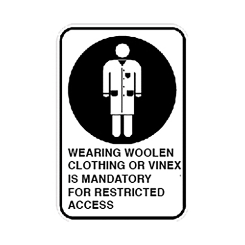 Sign – Wool clothing or vinex required for restricted access – Aluminum 0.064 – Engineer vinyl UV printing – 12×18 – STANDARD