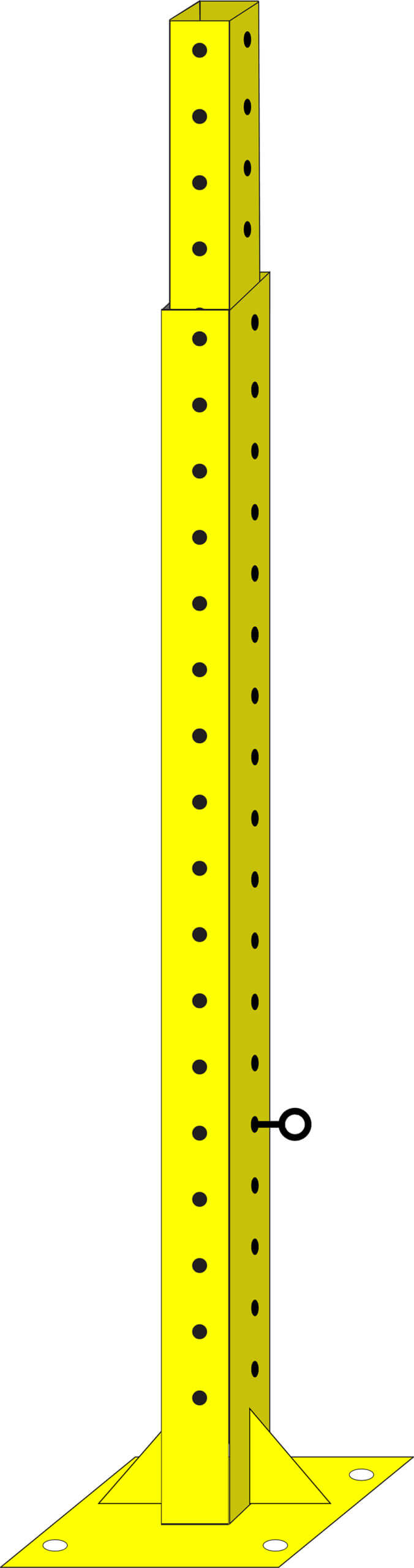 Telescopic pole adjustable from 42 to 60 inches. Ground installation base 8x8 in 3/16 steel, yellow paint; 4 reinforcements in 3/16 steel, yellow paint; Galvanized steel sleeve 2x2x30; Standard steel post; 1.75x1.75x42, yellow paint; 4 installation angles for handrail; Stop bar for adjustment.