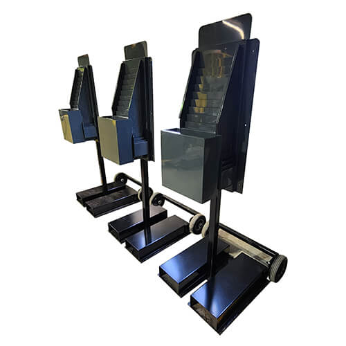 – 6″ diameter wheels, axles welded on flat bars for hand carrying,